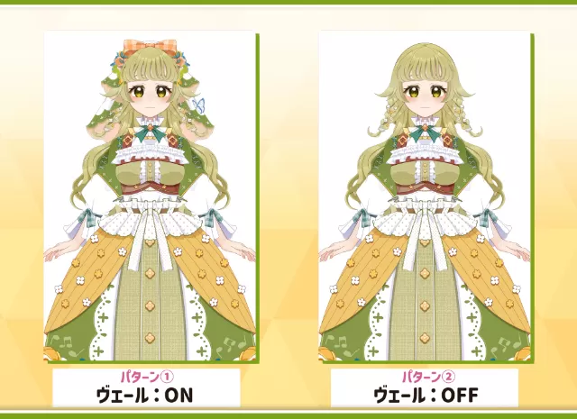 000.髪が長い, 102.胸が大きい, 200.キュート, 350.スカート, 351.フリル, 800.表情切り替え, 801.衣装切り替え, 900.カスタム可能
